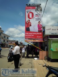 Keduanya sempat tergantung begitu kena aliran listrik dari kabel tegangan rendah yang melintang persis di atas baliho.