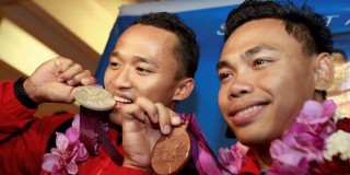 Tim Indonesia untuk Olimpiade London 2012, memberikan bonus kepada Eko Yuli Irawan dan Triyatno, yang meraih medali.