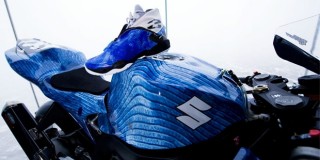 Dua sepeda motor Suzuki GSX-R1000 diberi motif garis-garis biru