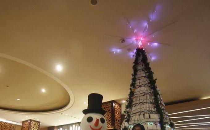 Public Relation Hotel Aston Samarinda, Carolyne Yevado Tohjoyo memperlihatkan Pohon Natal dengan daun berupa susunan 748 sandal, di Loby Hotel