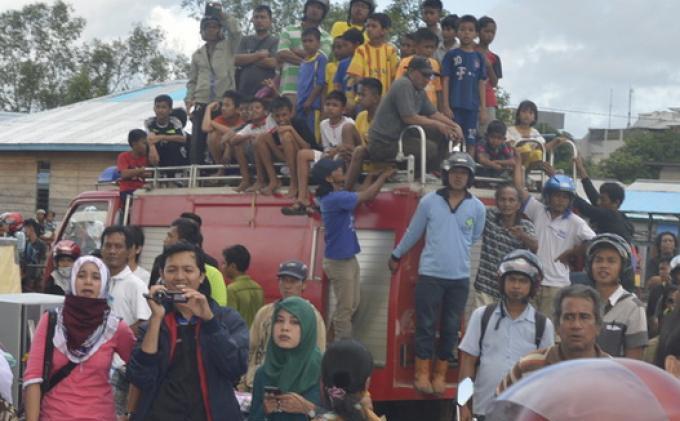 MENONTON - Puluhan warga menyaksikan kebakaran yang menimpa kawasan RT 14 Selumit Pantai Tarakan dari sebuah mobil pemadam, Senin (5/1).