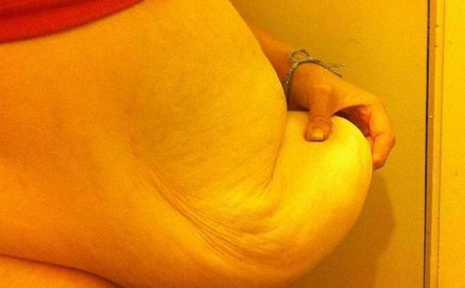 "Kulit saya menurun sangat rendah dibawah pusar dan di atas (maaf) vagina saya. Bahkan aku bisa mengangkatnya seperti memeluk bayi," ujarnya.