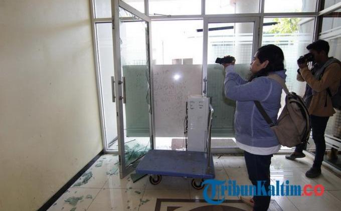 Kaca pintu asrama yang dilapisi kaca pecah, dirusak oleh oknum yang diduga anggota Brimob. Insiden pengrusakan itu terjadi pada Sabtu dini hari pukul 02.00.