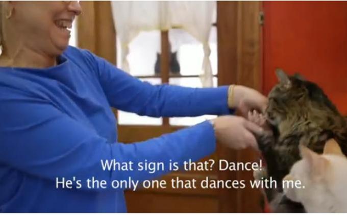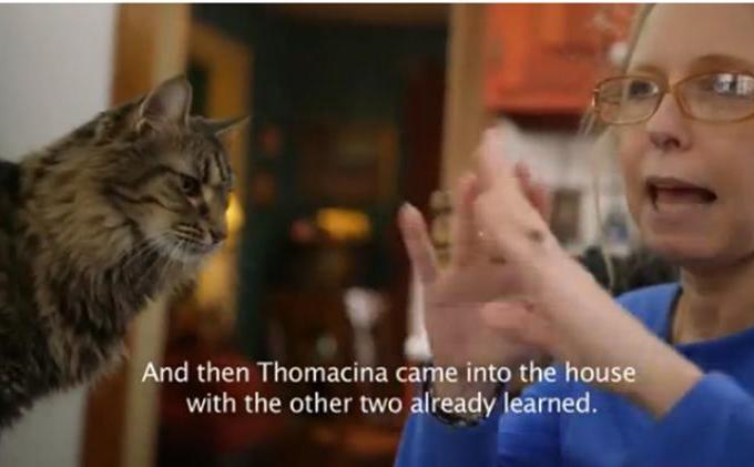 "Sejak putri saya belajar mengenal tanda-tanda dan gerak, aku punya ide bagaimana memperkenalkan gerak bahasa isyarat itu kepada kucing," katanya.