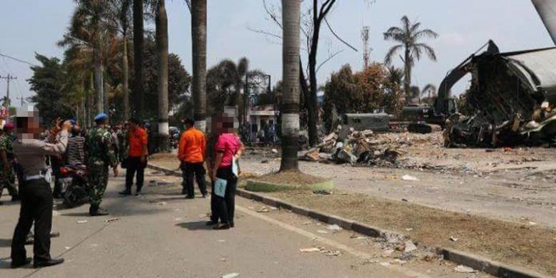 Aksi berfoto di depan reruntuhan pesawat C-130 Hercules yang jatuh di Medan pada Selasa (30/6/2015) mendapat kecaman di jagat maya. (Ist)