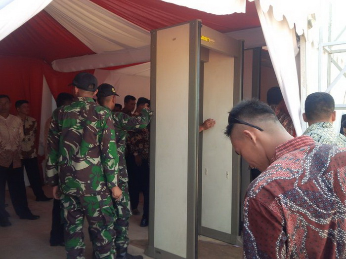 Petugas keamanan memasang pintu detektor di tenda raksasa tempat peresmian proyek berlangsung.