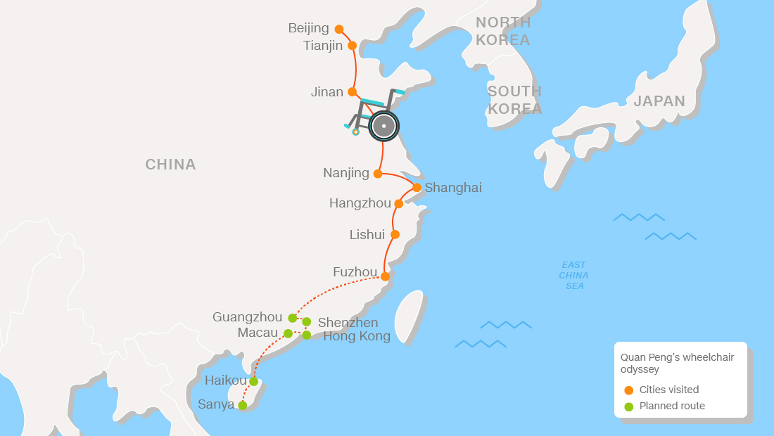 Quan telah melakukan perjalanannya bermodalkan kursi roda miliknya.