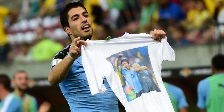 CHRISTOF STACHE/AFP Usai membobol gawang Brasil, Suarez memamerkan kaus bergambar dirinya dan Walter Fereira, seorang fisioterapis yang berjasa memulihkan cedera Suarez.