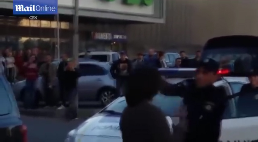 Peristiwa ini terjadi di Kiev. Polisi mengamankannya dengan cara menyemprotkan cairan merica ke wajahnya, serta memukulnya beberapa kali dengan sebilah tongkat.