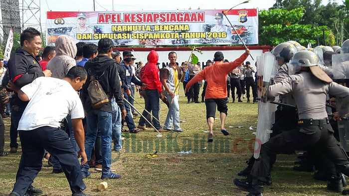 Latihan simulasi pengamanan kota, Kamis (29/9/2016) di Lapangan SPN Balikpapan melibatkan ratusan personel Polri.
