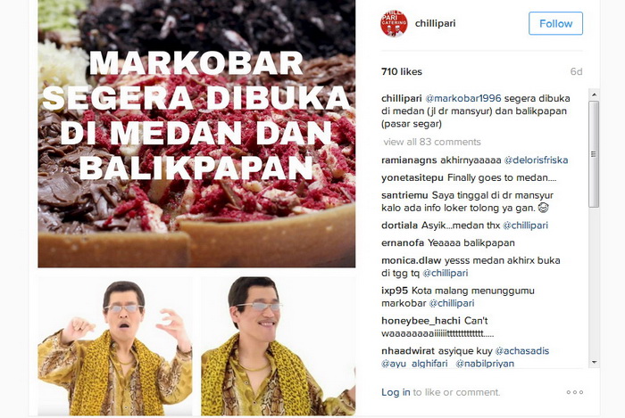 "@markobar1996 segera dibuka di medan (jl dr mansyur) dan balikpapan (pasar segar)," tulis keterangan foto tersebut.