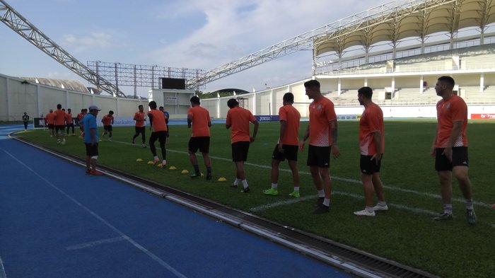 Skuad Arema FC saat menjajal lapangan Stadion Aji Imbut, Tenggarong, Kutai Kartanegara, Selasa (19/9/2017).