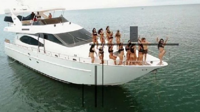 Tampak juga puluhan model berbikini yang berposes riang di sebuah haluan kapal pesiar, sementara sebuah caption di monitor video itu bertuliskan “unlimited sex included”.