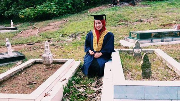 TRIBUNKALTIM.CO - Sebuah foto seorang wisudawati berfoto lengkap mengenakan toga di makam kedua orangtuannya ini baru-baru saja beredar di media sosial.