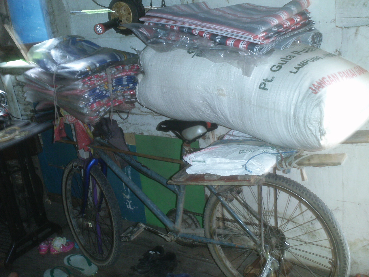 Biasanya, tukang jahit kasur membawa peralatan jahit, karung berisi gumpalan kapuk, dan kain kasur dengan bersepeda atau berjalan kaki.