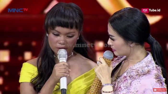 Pedangdut Iis Dahlia dan Waode Sofia, peserta Kontes Dangdut Indonesia (KDI), menangis dan berpelukan di panggung, Senin (30/7/2018).
