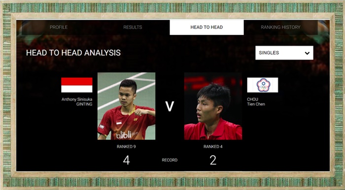 Berikut pertemuan Anthony Ginting Vs Chou Tien Chen seperti dikutip dari bwfbadminton.com: