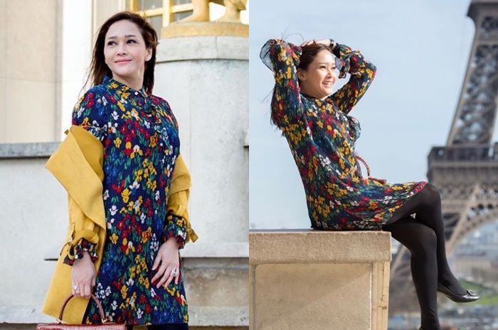 Kamu bisa banget bergaya seperti bunda Maia saat mengenakan flowery dress ini dengan paduan mules hitam polos agar terlihat lebih stylish.