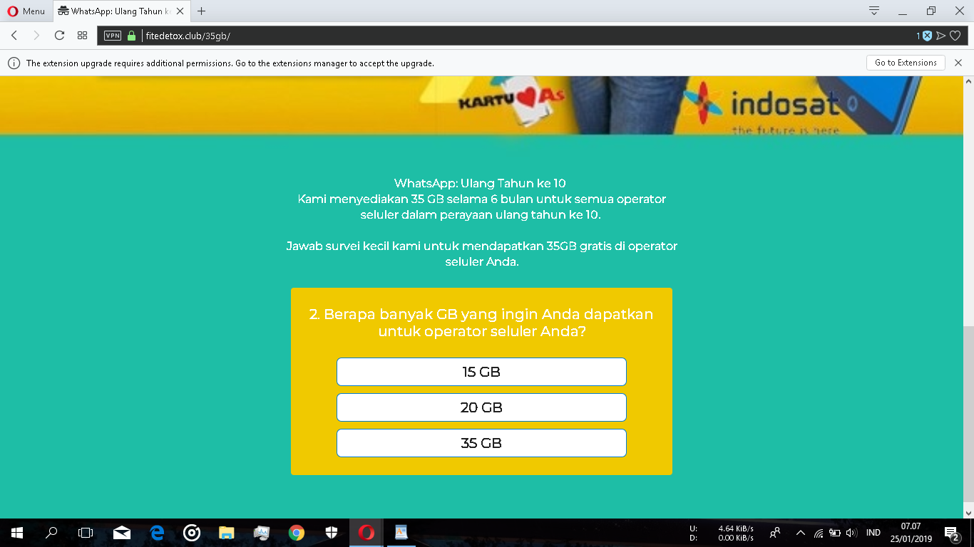 Saat mengklik alamat website tersebut, di halaman muka website Anda akan diwajibkan untuk menjawab surveri kecil-kecilan untuk dapat menerima kuota sebesar 35GB dari Ulang Tahun WhatsApp yang ke 10.