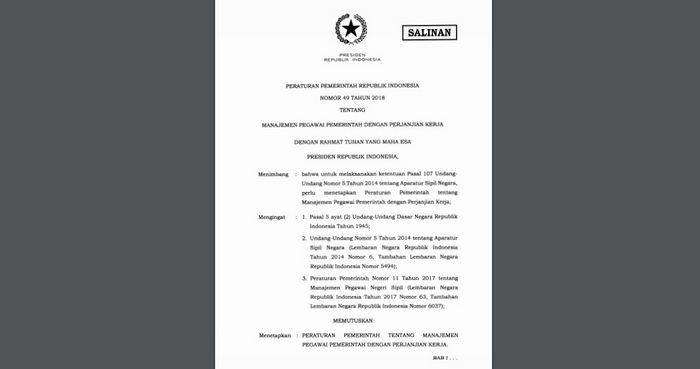 TRIBUNKALTIM.CO - Presiden Joko Widodo (Jokowi) telah menandatangani Peraturan Pemerintah Nomor 49 Tahun 2018 (PP Nomor 49 Tahun 2018) tentang Manajemen Pegawai Pemerintah dengan Perjanjian Kerja (P3K atau PPPK) pada awal Desember 2018 lalu.