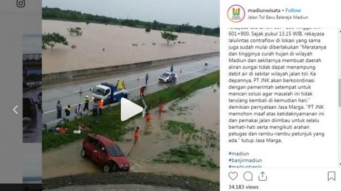 Dalam video yang beredar, tampak kondisi banjir Madiun khususnya di jalan tol Madiun cukup parah. Separuh jalan tol tampak berubah menjadi kolam.