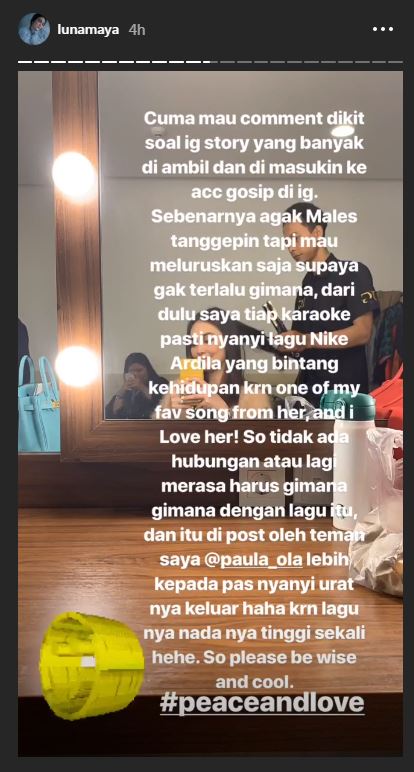"Cuma mau comment dikit soal ig story yang banyak di ambil dan di masukin ke acc gosip di ig. Sebenarnya agak Males tanggepin tapi mau meluruskan aja supaya gak terlaly gimana, dari dulu saya tiap karaoke pasti nyanyi lagu Nike Ardila yang bintang kehidupan krn one of my fav song from her, and i Love her! So tidak ada hubungan atau lagi merasa harus gimana gimana dengan lagu itu, dan itu di post oleh teman saya @paula_ola lebih kepada pas nyanyi uratnya keluar haha krn lagunya nada nya tinggi sekali hehe. So please be wise and coll #peaceandlove."
