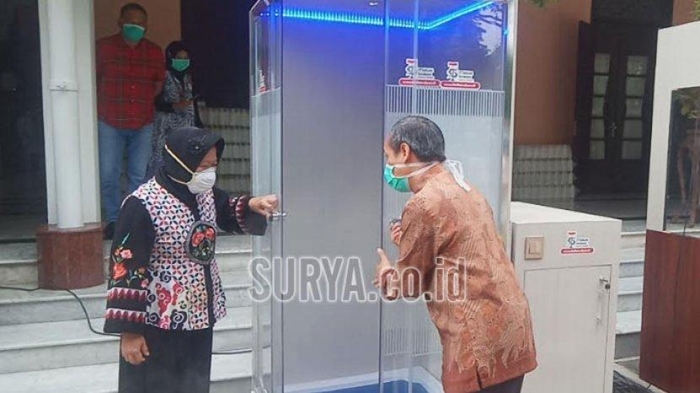 Walikota Surabaya, Tri Rismaharini alias Risma telah menempatkan sejumlah bilik disinfektan di ruang publik guna mencegah penyebaran Virus Corona.
