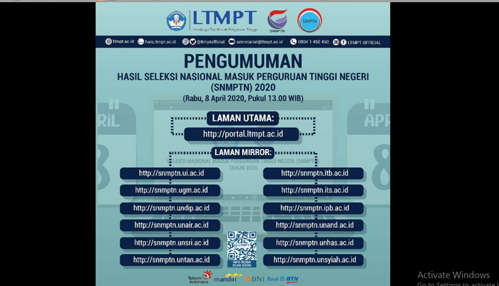 Rencananya, pengumuman SNMPTN 2020 bakal diumumkan secara resmi oleh Lembaga Tes Masuk Perguruan Tinggi ( LTMPT) pada Rabu (8/4/2020) mulai pukul 13.00 WIB.