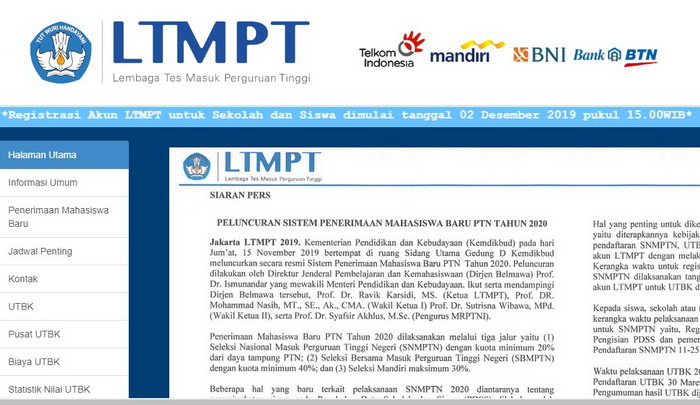 Pemberitahuan di situs ltmpt.ac.id : Registrasi Akun LTMPT untuk Sekolah dan Siswa dimulai tanggal 02 Desember 2019 pukul 15.00WIB. Cek juga jadwal pendaftaran SBMPTN 2020