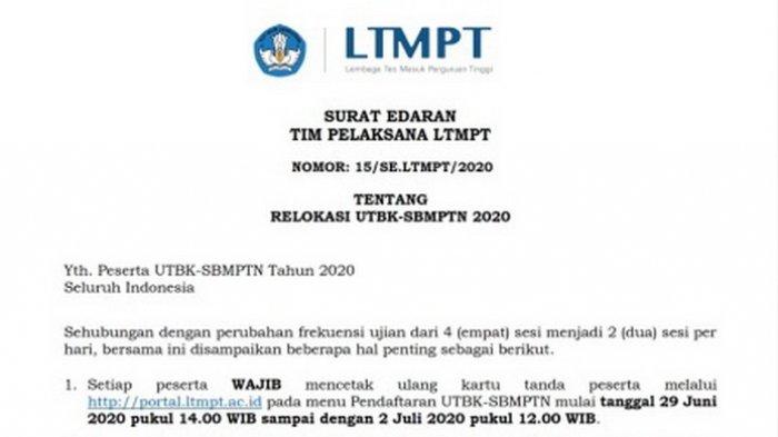 1. Setiap peserta Wajib mencetak ulang kartu tanda peserta melalui https://portal.ltmpt.ac.id/ pada menu pendaftaran UTBK SBMPTN mulai 29 Juni pukul 14.00 WIB hinga 2 Juli pukul 12.00 WIB.