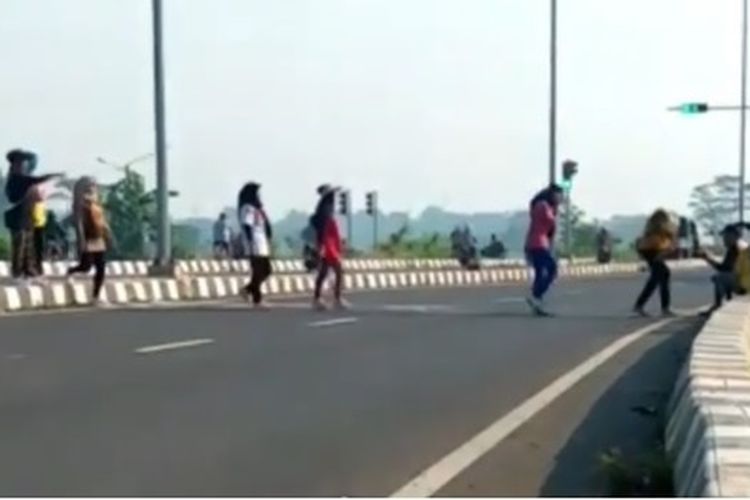 Video tujuh orang emak-emak berjoget sambil menyeberang di exit Tol Sentono, Kota Pekalongan, Jawa Tengah, viral. Diduga untuk membuat konten