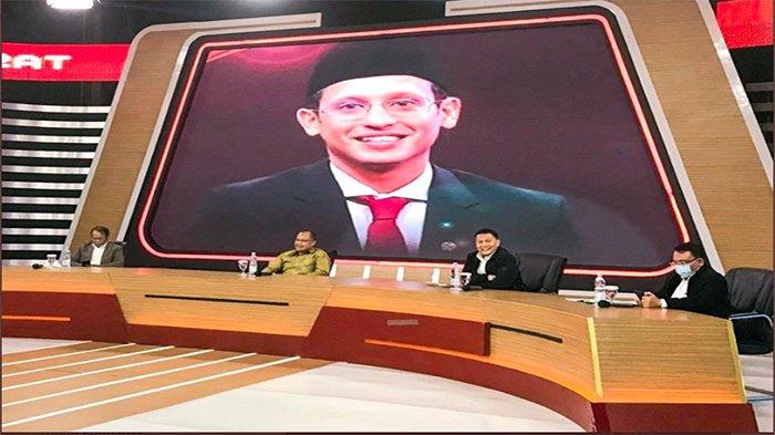 Mendikbud, Nadiem Makarim saat tampil sebagai narasumber di ILC TV One. Dibahas di ILC TV One tadi malam, KPK didesak turun tangan, mengenal POP bikinan Nadiem Makarim yang bikin Muhammadiyah dan NU mundur.