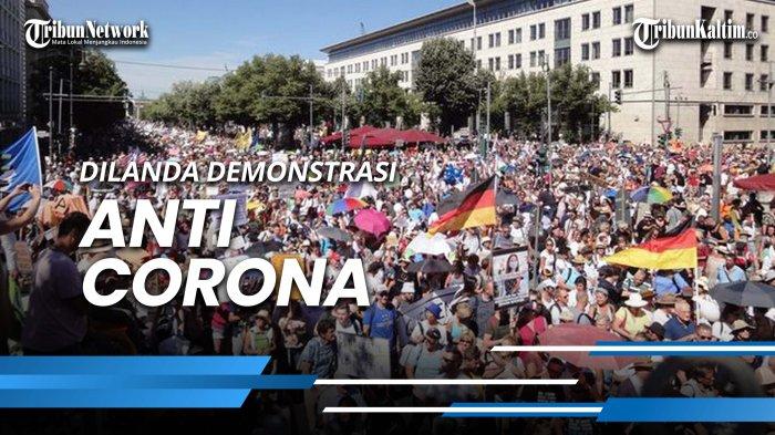 TRIBUNKALTIM.CO - Ribuan rakyat Jerman turun ke jalan di Berlin untuk memprotes pembatasan terkait virus corona pada Sabtu (29/8/2020).