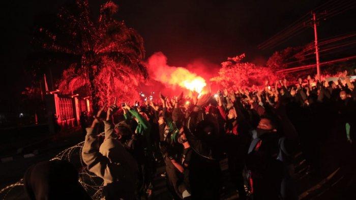 TRIBUNKALTIM.CO, SAMARINDA - Dalam aksi lanjutan demonstrasi penolakan Omnibus Law UU Cipta Kerja, di depan Gedung Dewan Perwakilan Rakyat Daerah Kalimantan Timur ( DPRD Kaltim ), Jalan Teuku Umar, Kelurahan Karang Anyar, Kecamatan Sungai Kunjang, Kota Samarinda, Provinsi Kalimantan Timur pada Senin, 12 Oktober 2020 berakhir dengan kericuhan.