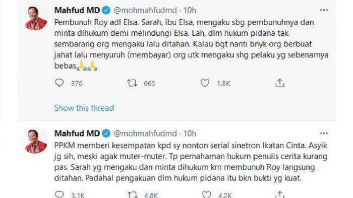 Baca juga: Mahfud MD Kritik Jalan Cerita Sinetron Ikatan Cinta, Komentarnya Soal Hukum di Twitter jadi Sorotan