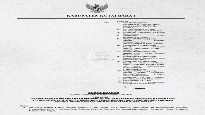 Kebijakan itu tertuang dalam surat edaran (SE) Bupati Kutai Barat nomor 965/SEK.635/STG-KBR/VIII/2021 dan mulai berlaku tanggal 3 sampai 9 Agustus 2021.