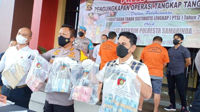 TRIBUNKALTIM.CO, SAMARINDA - Ada banyak barang bukti yang diperlihatkan dalam rilis pengungkapan Operasi Tangkap Tangan (OTT) perkara pungutan biaya Pendaftaran Tanah Sistimatis Lengkap (PTSl) yang dilakukan oleh Lurah Sungai Kapih, Edi Apriliansyah bersama rekannya Rusli, di Mapolresta Samarinda, Senin (11/10/2021) sore ini.