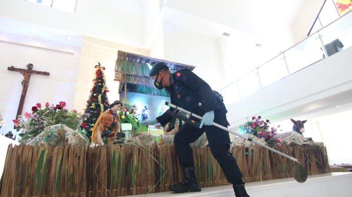 TRIBUNKALTIM.CO, BALIKPAPAN- Satbrimob Polda Kaltim melakukan sterilisasi sejumlah gereja di wilayah Kalimantan Timur termasuk Kota Balikpapan, Jumat (24/12/2021).