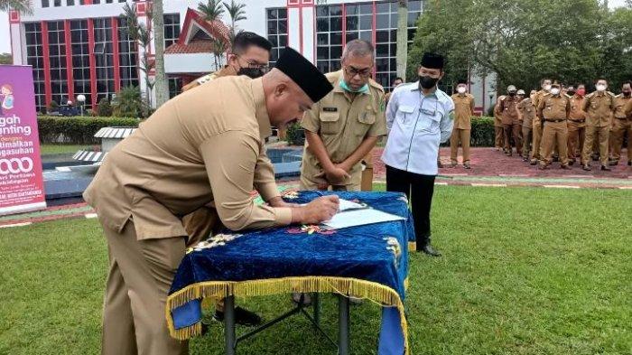 TRIBUNKALTIM.CO, TENGGARONG - Bupati Kutai Kartanegara (Kukar), Edi Damansyah menandatangani komitmen bersama pencegahan stunting.