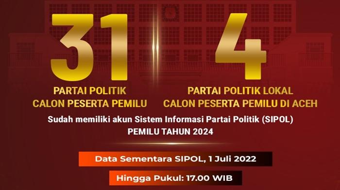 Berikut 31 Partai Politik Nasional calon peserta pemilu dan 4 Partai Politik Lokal calon peserta pemilu di Aceh yang sudah memiliki akun Sipol pemilu tahun 2024 per Jumat (1/7/2022) pukul 17.00 Wib, dikutip dari akun twitter resmi KPU RI @KPU_ID.
