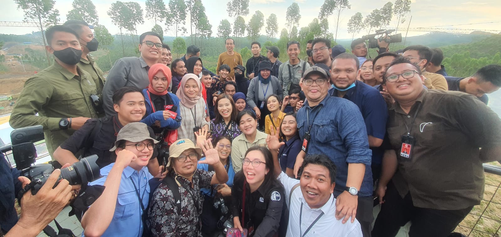 Dalam kesempatan tersebut, Presiden Jokowi menyempatkan diri berfoto dengan awak media di lokasi pembangunan Bangunan Kantor Presiden IKN Nusantara.