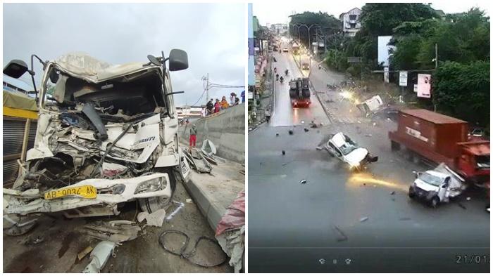 Truk lepas kendali dan menyeruduk empat mobil dan lima motor yang sedang berhenti di lampu merah.Â