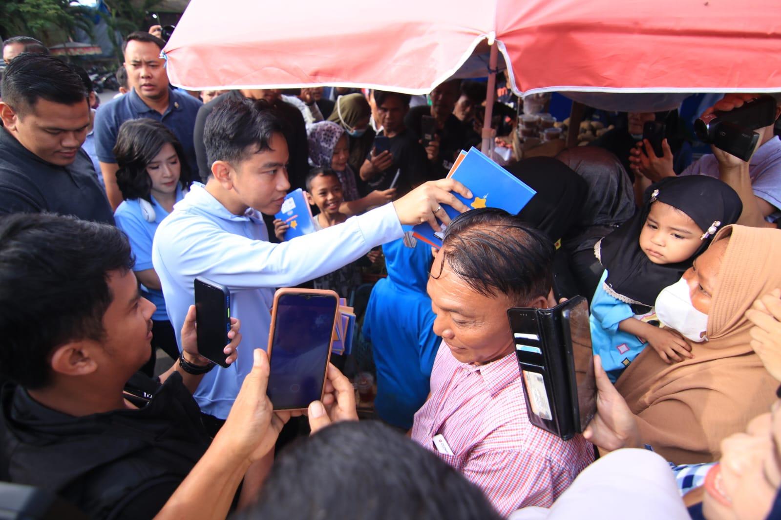 Saat blusukan perdananya di kawasan Pasar Pandansari kota Balikpapan, Kalimantan Timur pada Sabtu pagi (16/12/2023), Cawapres Gibran Rakabuming Raka membagikan buku tulis beserta susu kotak sebagai tambahan nutrisi kepada anak-anak yang ada di Pasar Pandansari.