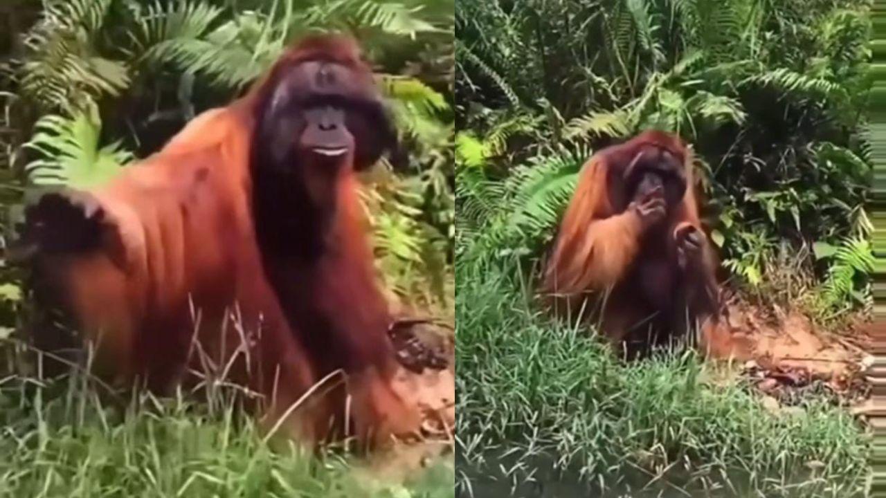 Dalam cuplikan awal video tersebut, terlihat Orang Utan berukuran besar duduk di pinggir rawa sambil mengulurkan tangannya.