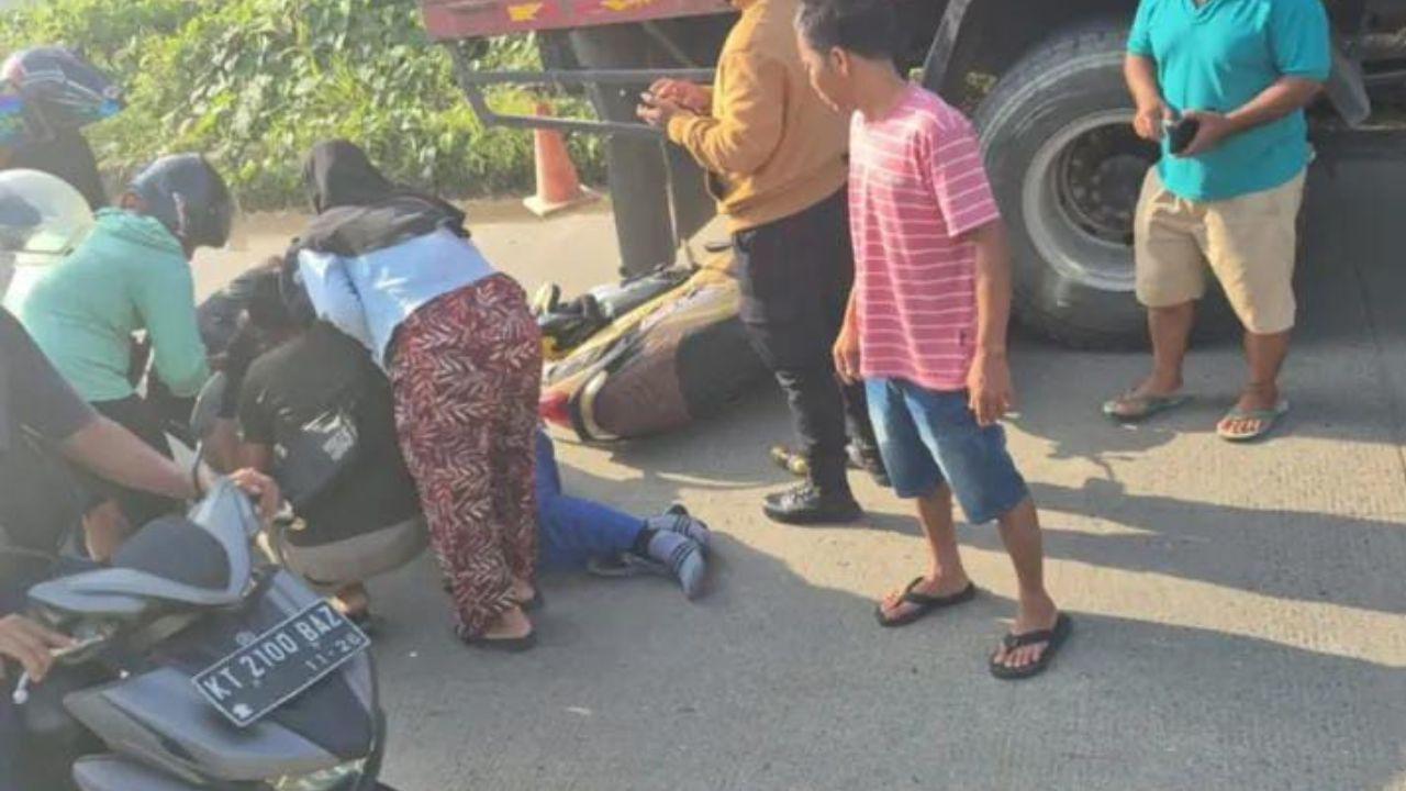 Insiden kecelakaan lalu lintas melibatkan seorang driver ojol dan truk yang parkir di bahu Jalan PM Noor, Samarinda, Kaltim hari Kamis (24/7/2025).