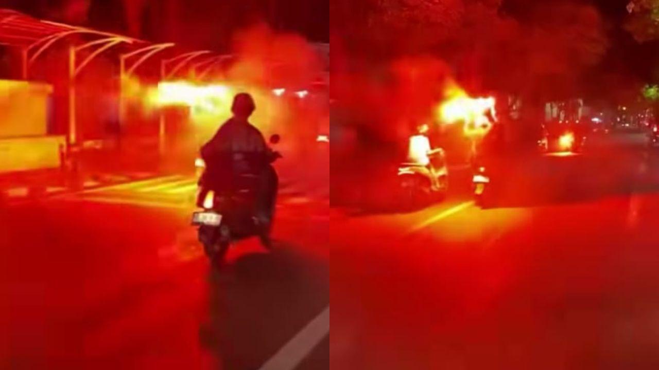 Dalam video yang direkam oleh seorang pengguna jalan dan diunggah ke berbagai platform media sosial, pemotor berada di jalanan sambil menyalakan flare berwarna merah.