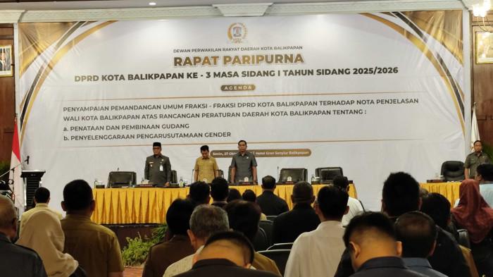 Rapat tersebut beragenda penyampaian pandangan umum fraksi terhadap nota penjelasan Wali Kota Balikpapan atas dua rancangan peraturan daerah (Raperda), yakni Raperda tentang Penataan dan Pembinaan Gudang serta Raperda tentang Penyelenggaraan Pengarusutamaan Gender.