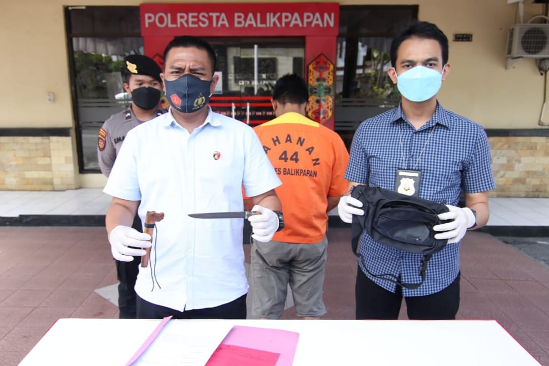 Pedagang berinisial AS (47) digiring menuju Mapolresta Balikpapan akibat kedapatan mengantongi sajam