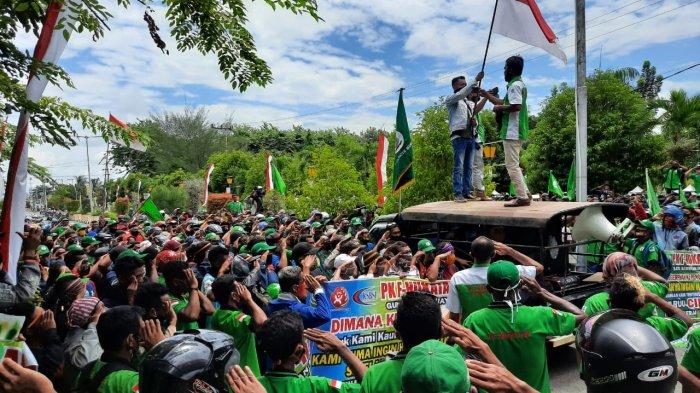 Ratusan buruh dari Federasi Kehutanan Industri Umum Perkayuan Pertanian dan Perkebunan Konfederasi Serikat Buruh Sejahtera Indonesia (F-Hukatan KSBSI